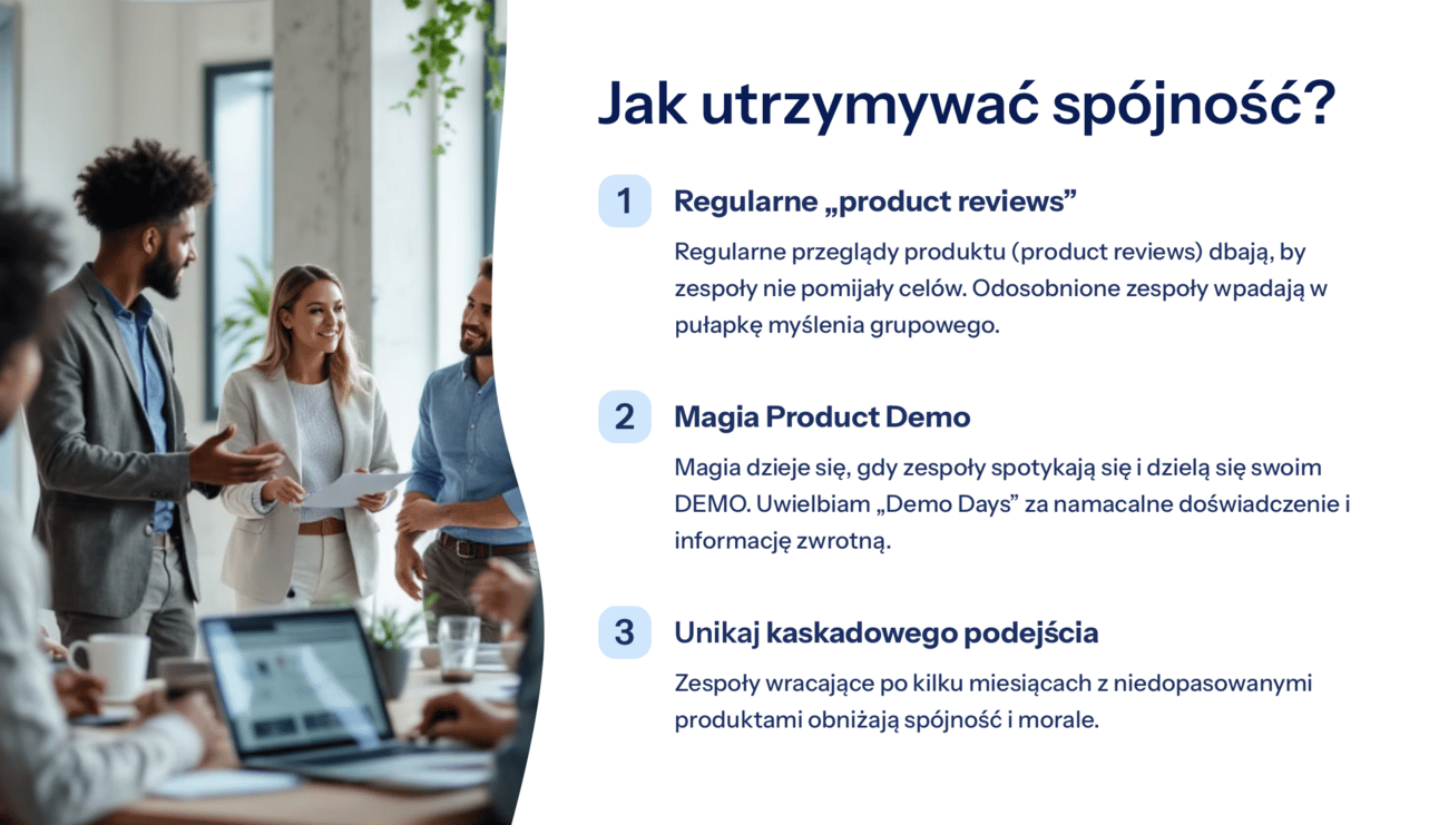 Trzeba nieustannie przypominać nie tylko, co robimy, ale przede wszystkim, dlaczego to robimy. Kontekst biznesowy musi być obecny na spotkaniach typu all-hands, w komunikacji wewnętrznej i podczas planowania. Nie wystarczy ogłosić roczny plan na jednym spotkaniu. To musi być regularny, powtarzalny rytm potwierdzania kierunku.